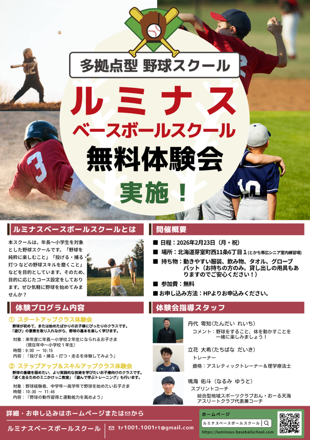 2026年4月の開校に先駆け、ルミナスベースボールスクールの指導をいち早く体感していただける「無料体験会」を開催いたします!